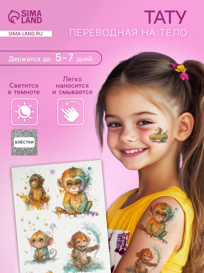 Переводные тату на тело светящиеся с блёстками «Обезьянка», 7.5×12 см