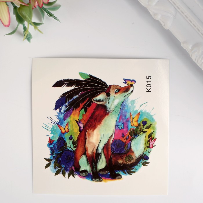 Татуировка на тело цветная "Лис-индеец с бабочками" 8х8 см