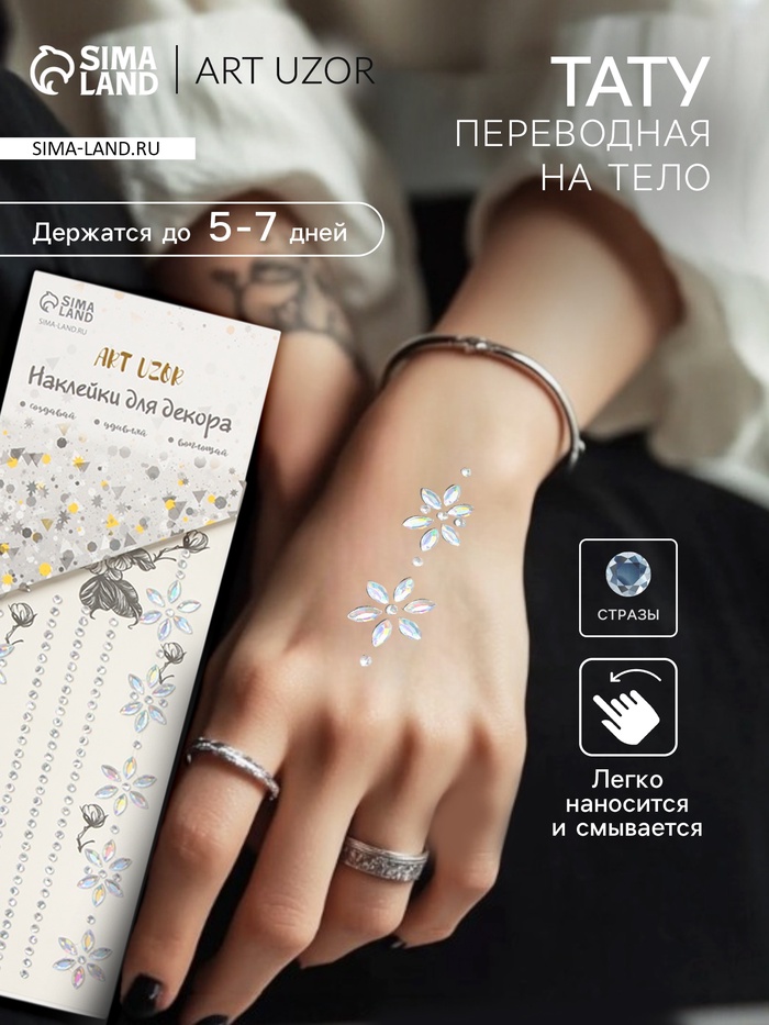 Переводная тату на тело и стразы «Цветочная аппликация», набор 2 листа, серебро, 18×8 см