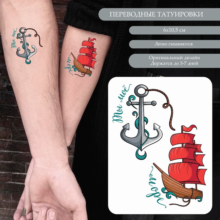 Переводные тату парные «Арт Узор. Корабль и якорь: Ты моё море», временные татуировки цветные, 10.5×6 см