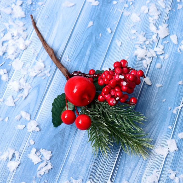 Еловая ветка декоративная «Зимнее волшебство. Грёзы», яблоко, красная калина, 17 см