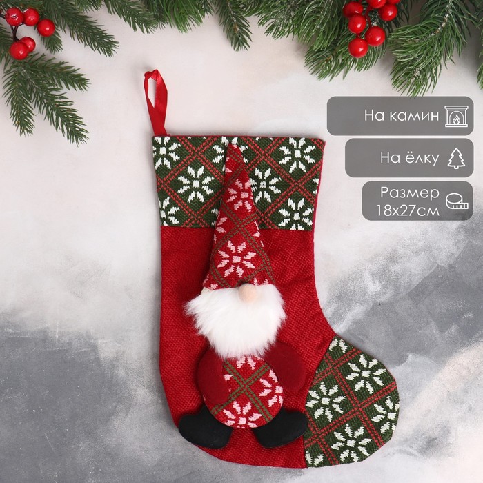 Подвеска на ёлку «Носок - Дед Мороз в длинном колпаке», мягкая, 18×27 см, зелёный/красный