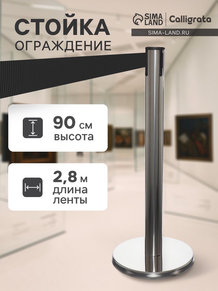 Стойка ограждения серебристая, с чёрной вытяжной лентой 280 см, высота 90 см, d=6 см, напольный d=32 см