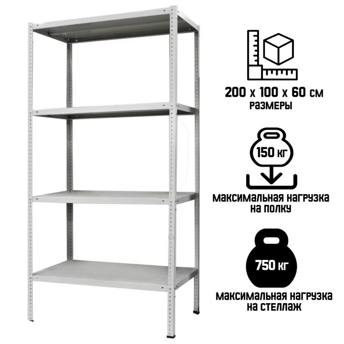 Стеллаж металлический для склада напольный ПАКС металл МС-264, 4 полки, 200×100×60 см, серый