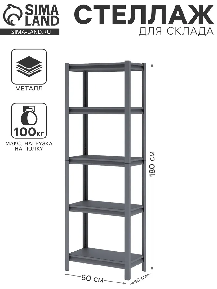 Стеллаж металлический для склада Everest Lite-50, 5 полок, 180×90×40 см, тёмно-серый