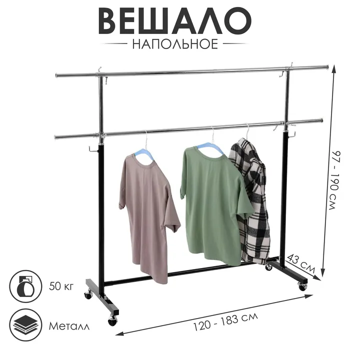 Вешало П-образное c двумя перекладинами 120-183×43×97-190 см, цвет чёрный
