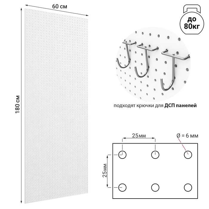 Настенная перфорированная панель односторонняя 60×0,6×180 см, шаг 2,5 см, цвет белый