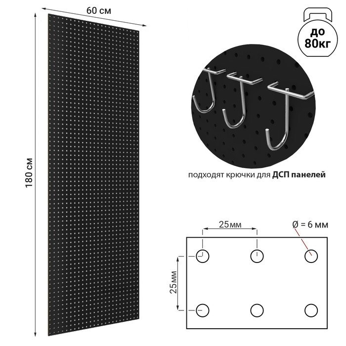 Настенная перфорированная панель односторонняя ДСП, 60×0,6×180 см, шаг 25 мм, цвет чёрный