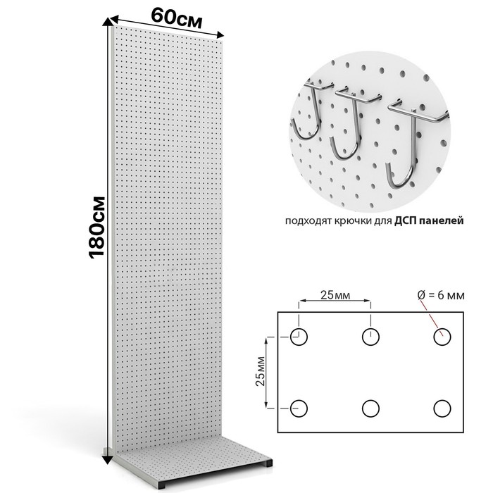 Стойка перфорированная металлическая на каркасе из трубы, 60×180, шаг 2.5 см, белая