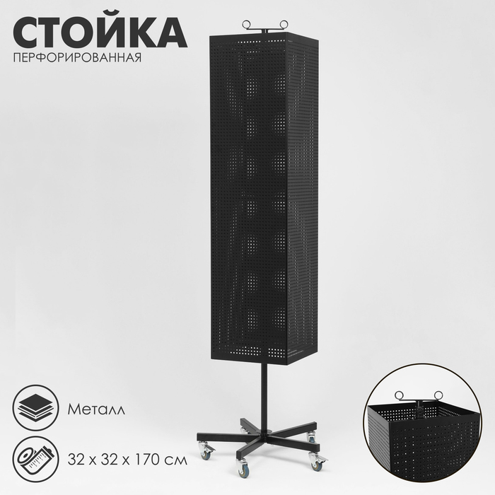 Стойка перфорированная металлическая на каркасе из труб, разборная, на колесах, 4 стороны, крутящиеся, 32×32×170 см, чёрная