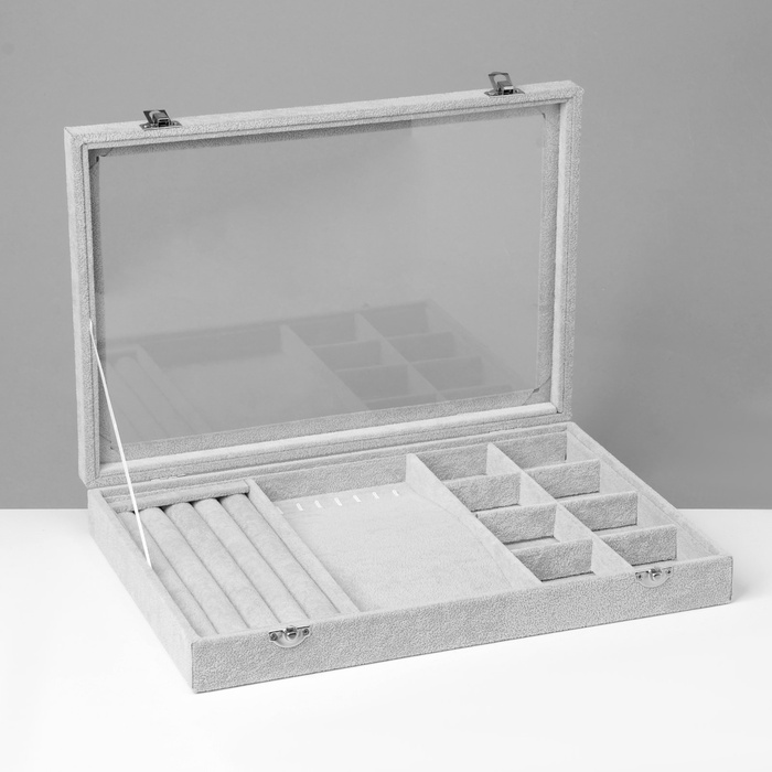 Шкатулка 4 полос,6 кр., 8 яч., стекл. крышка, серая