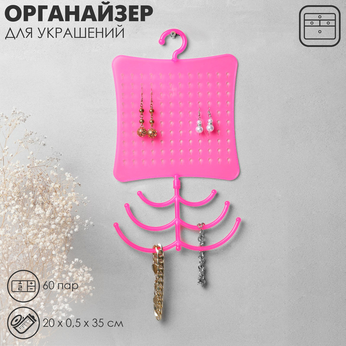 Органайзер для украшений QF с крючком, 60 пар, 6 крючков, пластик, 20×0.5×35 см, розовый