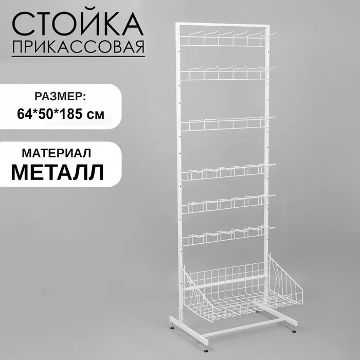 Стойка прикассовая, с 6-штыревой гребенкой и крючками, 64×50×185 см, цвет белый