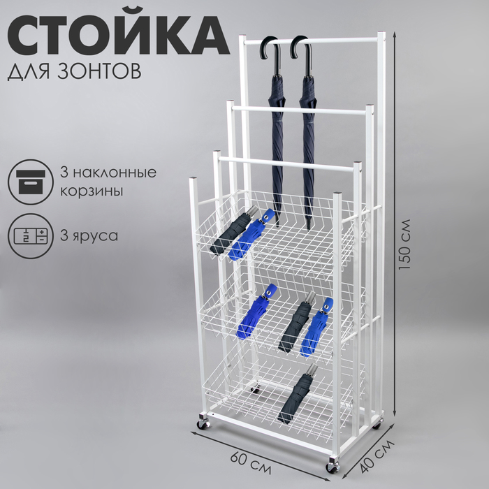Стойка под зонты, разборная, 3 наклонные корзины, 3 яруса, 60×40×150 см, цвет белый