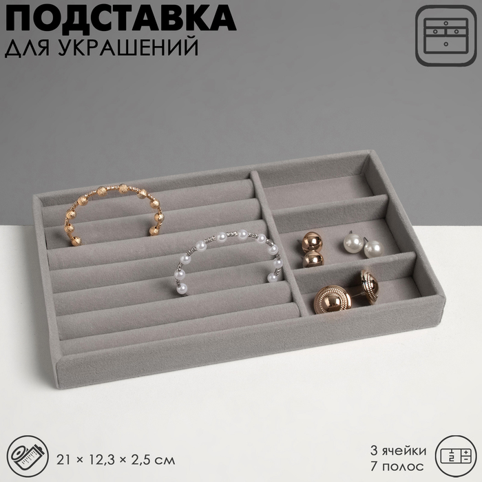Подставка для украшений QF 3 ячейки и 7 полос для колец, флок, 21×12,3×2,5 см, цвет серый