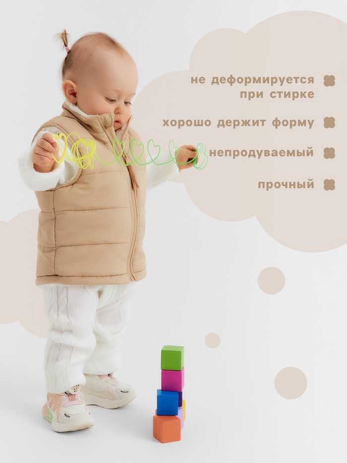 Изготовленные из мягких и гипоаллергенных материалов, жилеты защищают ребёнка от ветра и сохраняют тепло. Они легко надеваются и снимаются, что упрощает процесс одевания и делает их отличным выбором для молодых родителей.