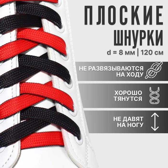 Шнурки для обуви, пара, плоские, двусторонние, 8 мм, 120 см, чёрные, красные