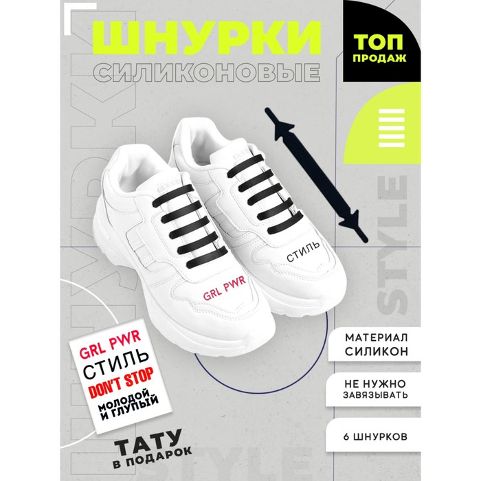 Шнурки силиконовые, цвет чёрный, набор 6 шт + переводное тату