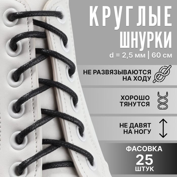Шнурки для обуви, пара, круглые, вощёные, d = 2,5 мм, 60 см, фасовка 25 шт, цвет чёрный