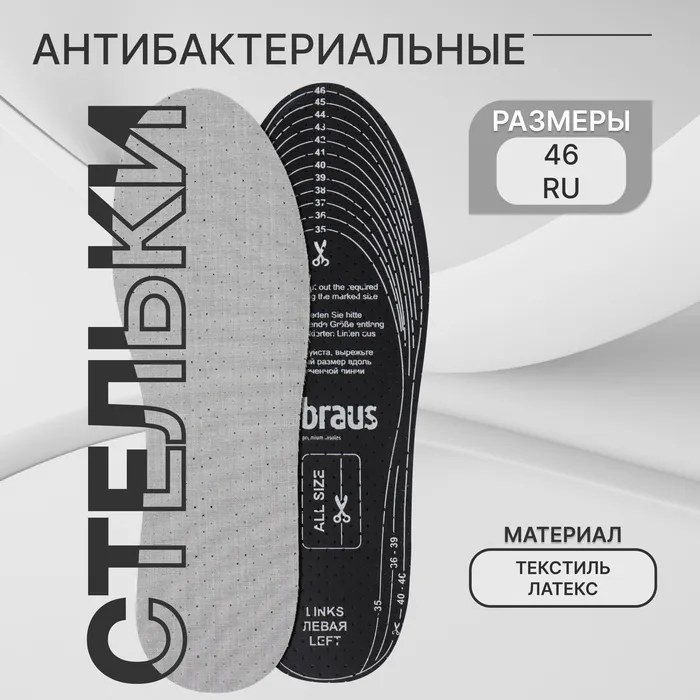 Стельки для обуви, антибактериальные, дышащие, универсальные, 35-46 р-р, 29,5 см, пара, цвет серый
