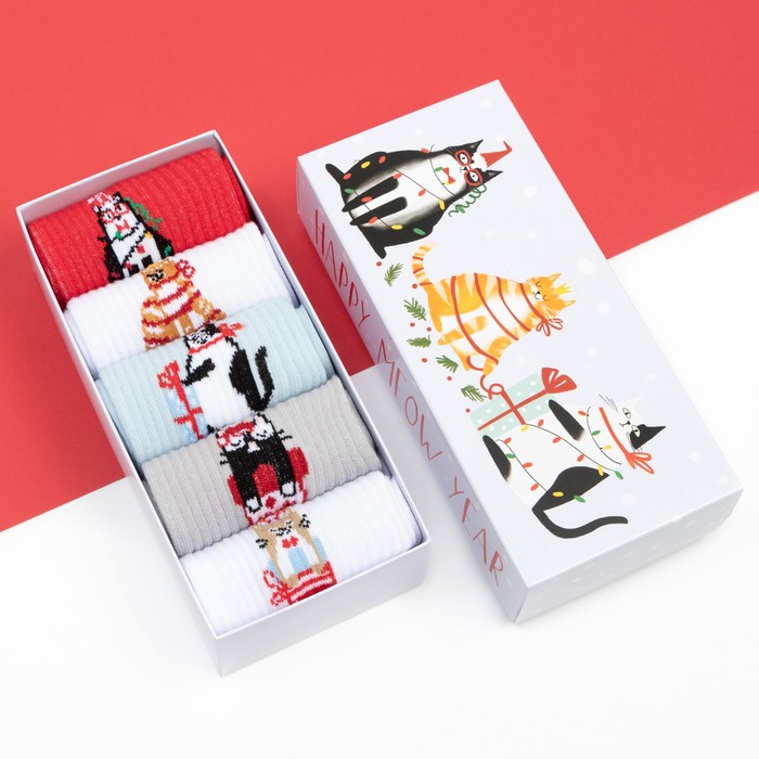 Носки женские новогодние «Котики» размер 36-39 (23-25 см), набор 5 пар