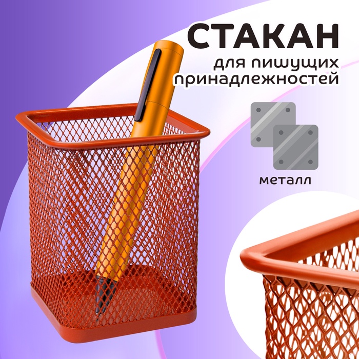Стакан для пишущих принадлежностей, квадратный, сетка металлическая, оранжевый