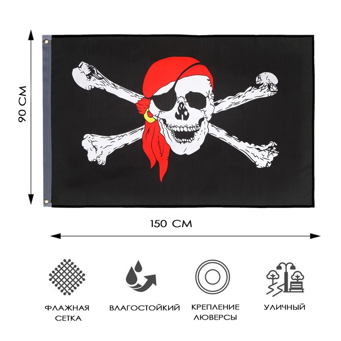 Пиратский флаг с черепом «Весёлый роджер», большой, 90×150 см, полиэстер, с люверсами