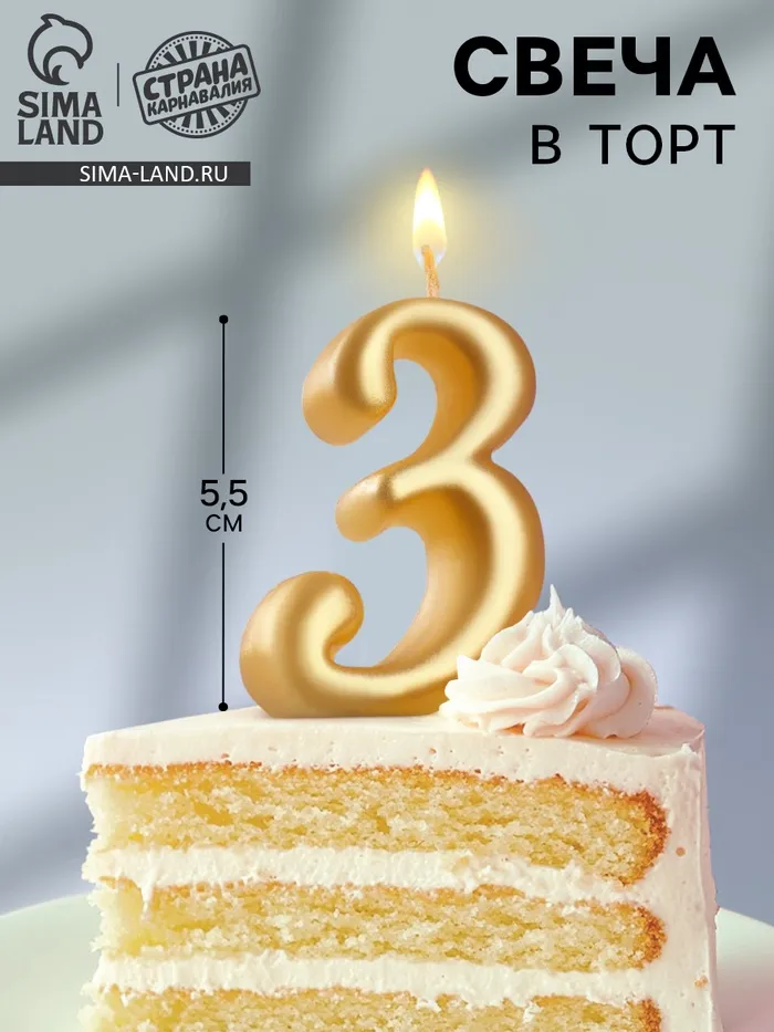 Свеча для торта «Цифра 3», золотая, 5.5 см