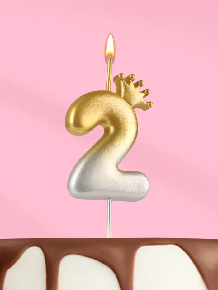 Свеча в торт «С короной», цифра 2, золото - серебро