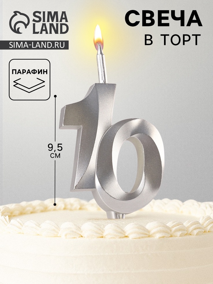 Свеча в торт «Юбилейная», цифра 10, серебряная