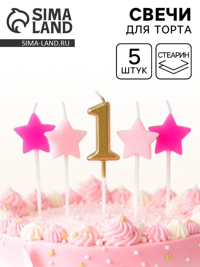 Свечи для торта «1-ый День Рождения Девочки», золото/розовый, 2.5×3.5 + 4 см, 5 шт.