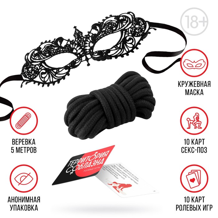 Верёвка и маска в секс игре для пар «Территория соблазна», 3 в 1 (20 карт, веревка, маска), 18+