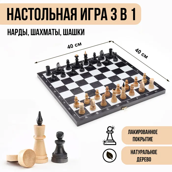 Настольные игры 3 в 1: нарды, шахматы, шашки, деревянные, большие, 40 х 40 см