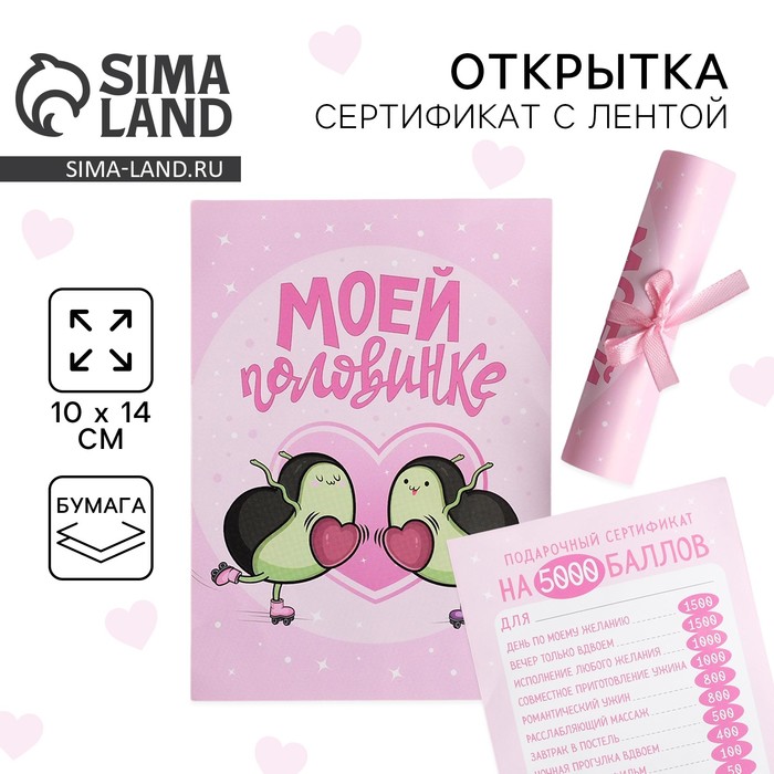 Открытка, сертификат с лентой «Моей половинке», 10 х 14 см.