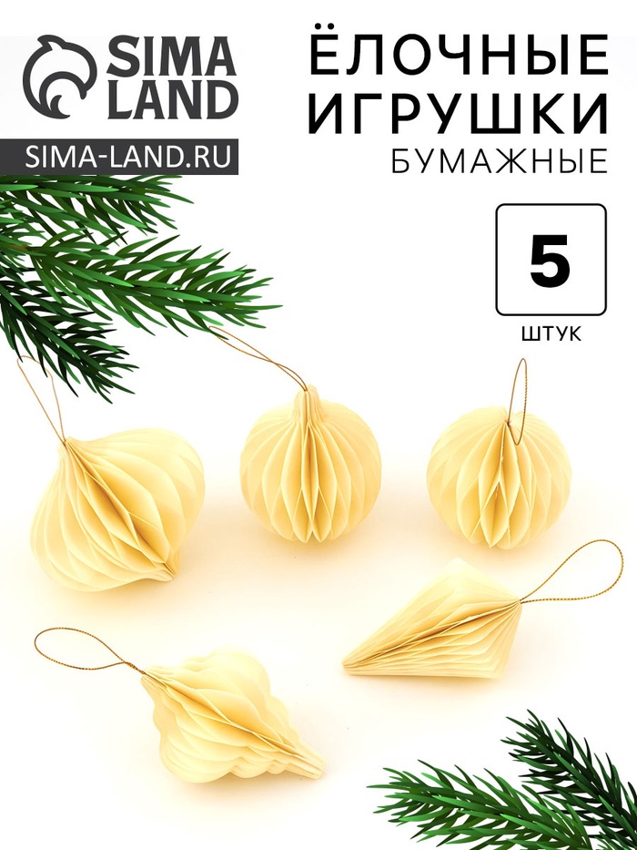 Елочные игрушки из бумаги, набор 5 штук, бежевые
