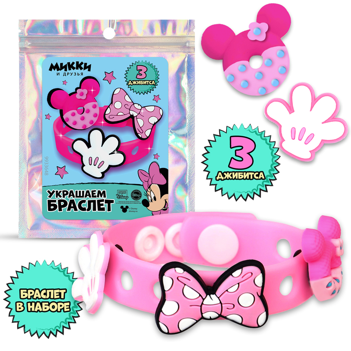 Браслет силиконовый со сменными джибитсами, 3 джибитса в комплекте, Минни Маус