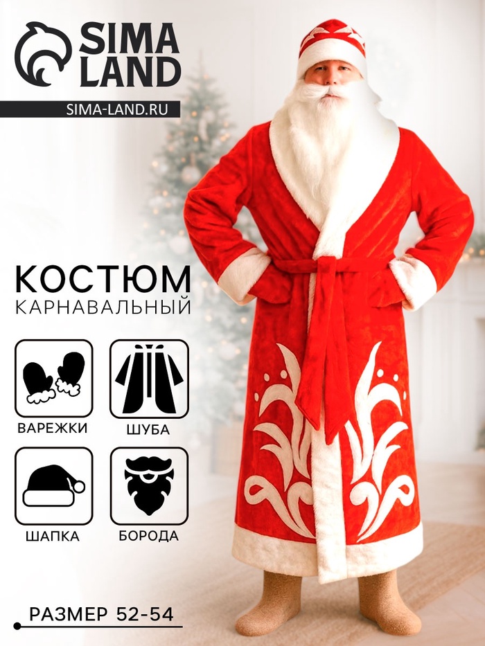 Карнавальный костюм красный «Дед Мороз»: шуба, шапка, варежки, борода, 52-54, рост 180