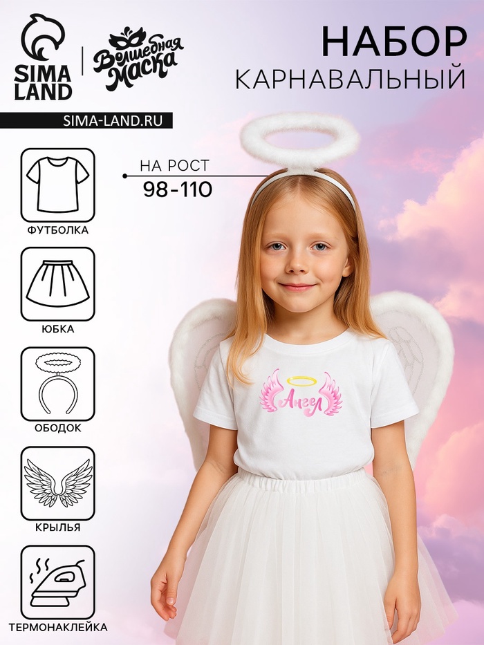 Карнавальный набор «Ангел»: футболка, юбка, крылья, ободок, термонаклейка, рост 98–110 см