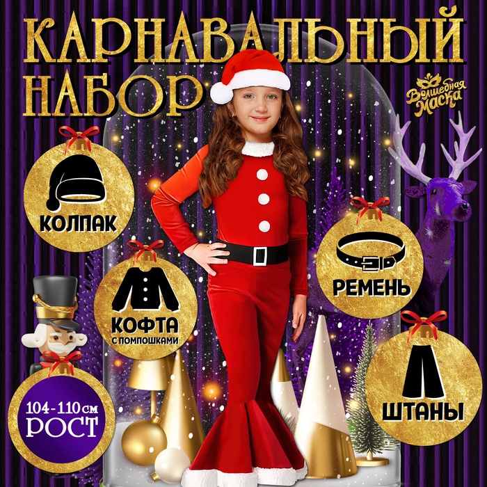 Карнавальный набор «Новогодняя куколка», рост 104-110 см, кофта, штаны, колпак, ремень
