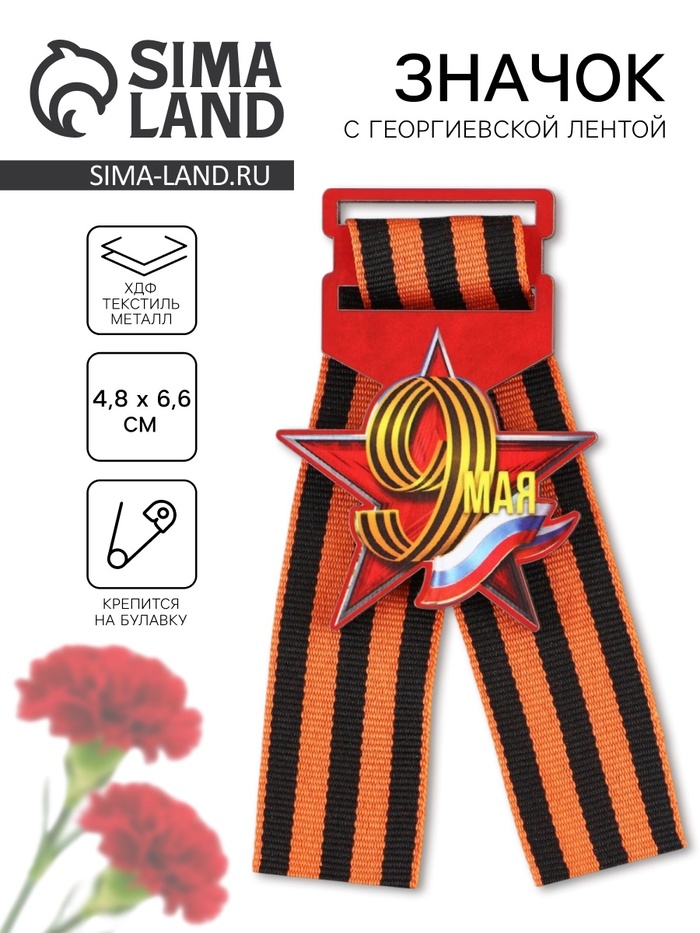 Значок с георгиевской лентой «9 мая, гвоздика», дерево, 4,8 х 6,6 см