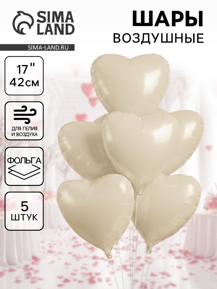 Воздушные шары фольгированные 17" «Сердце», молочный сатин, набор 5 шт.