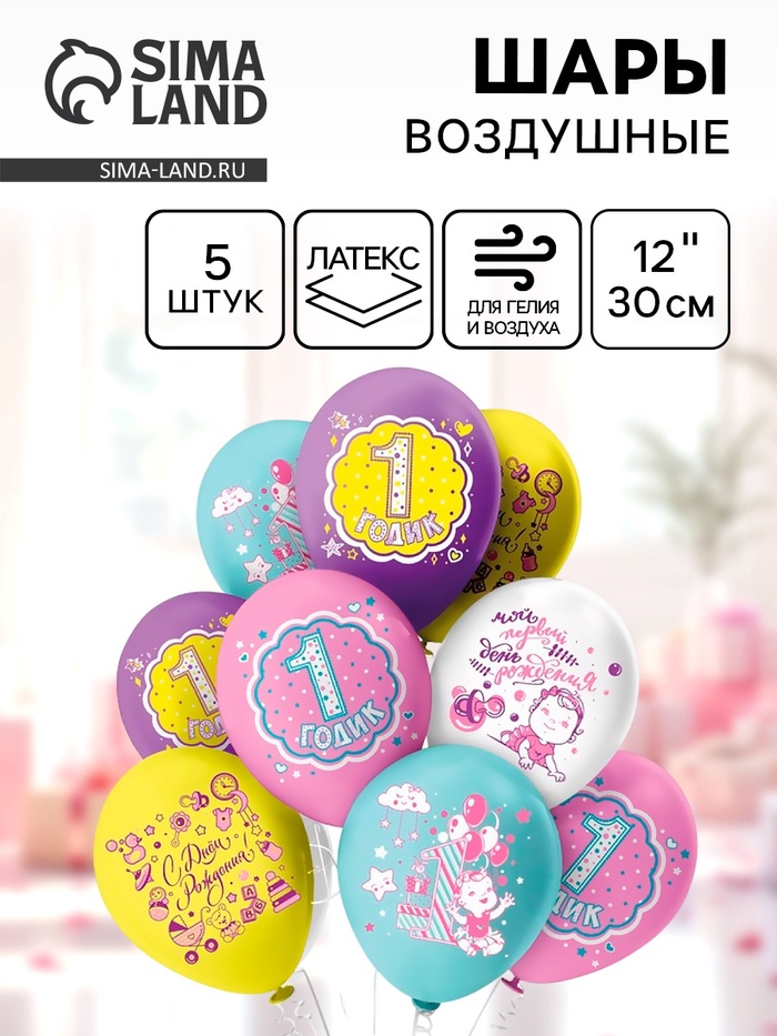 Воздушные шары латексные 12" «СДР 1 годик! Девочка!», 5 шт., МИКС