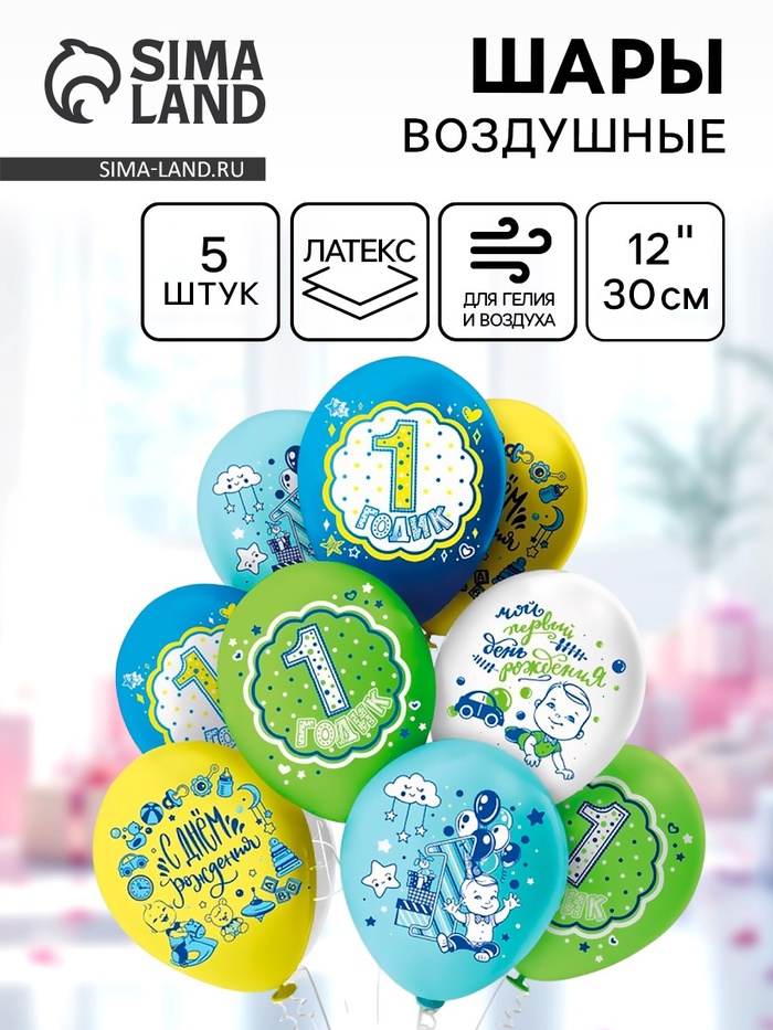 Воздушные шары латексные 12" «СДР 1 годик! Мальчик!», 5 шт., МИКС