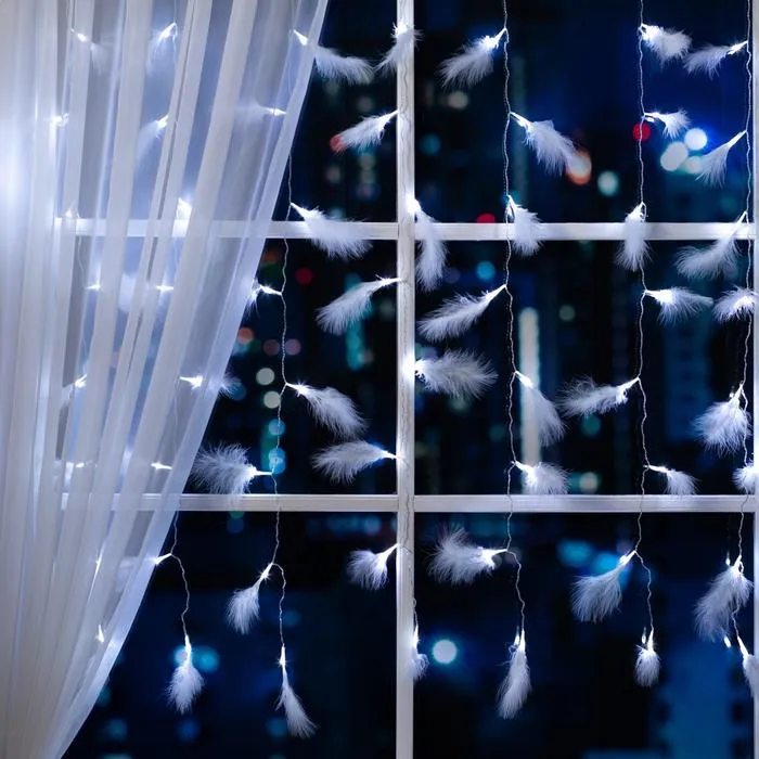 Гирлянда «Занавес» 3 × 1.4 м с насадками «Перья», IP20, прозрачная нить, 80 LED, свечение белое, 8 режимов, 220 В