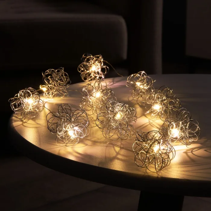 Гирлянда «Нить» роса 5 см, с насадками «Снежки», IP20, серебристая нить, 10 LED, батарейки ААх2 (не в комплекте), свечение тёплое белое
