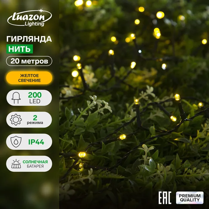 Гирлянда «Нить» 20 м, IP44, тёмная нить, 200 LED, свечение жёлтое, 2 режима, солнечная батарея