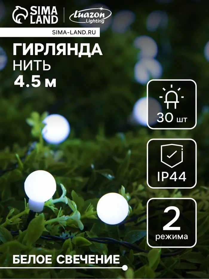 Гирлянда «Нить», 4.5 м, уличная, с насадками «Шарик», IP44, 30 LED, 2 режима, солнечная батарея, тёмная нить, свечение белое
