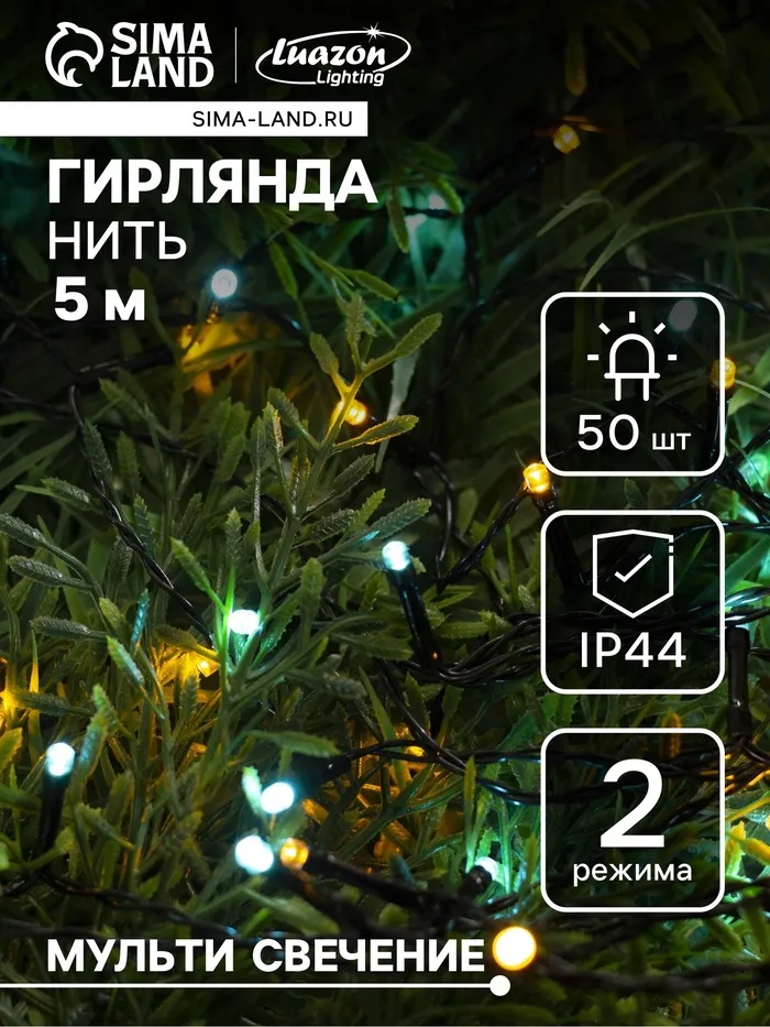 Гирлянда «Нить», 5 м, уличная, IP44, 50 LED, 2 режима, солнечная батарея, тёмная нить, свечение жёлтое/аквамарин