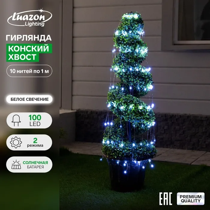 Гирлянда «Конский хвост» 10 нитей по 1 м, серебристая нить, 100 LED, свечение белое, 2 режима, солнечная батарея