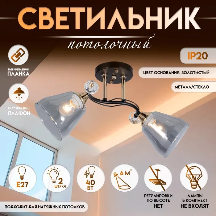 Светильник потолочный BayerLux «Клео», люстра 2×Е27, 40 Вт, чёрный, 50×22×24 см